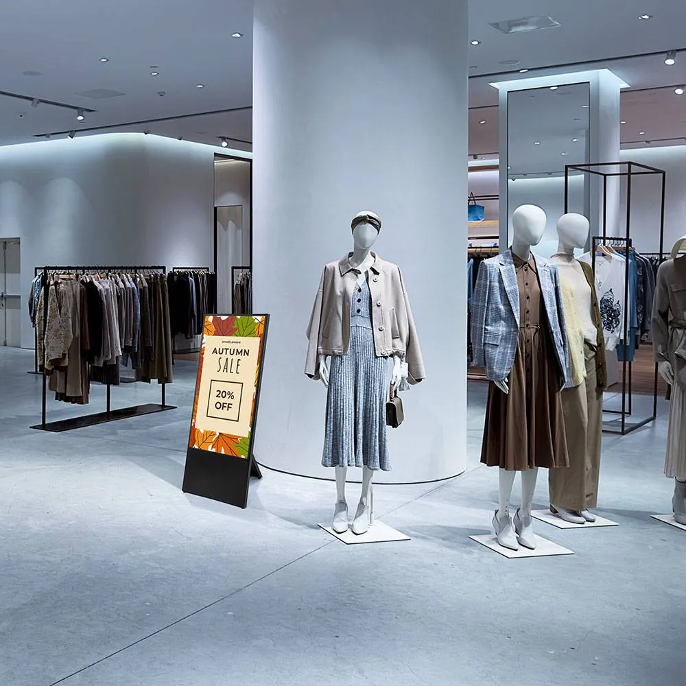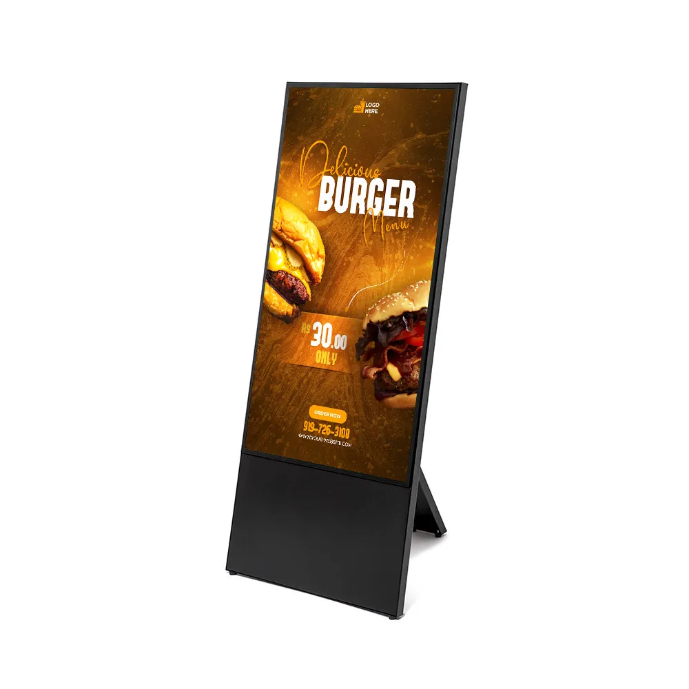 Digitální áčko Edge s obrazovkou 43" pro dynamickou interiérovou prezentaci. Tenký design, stabilní konstrukce a snadná manipulace pro promo akce, prodejny i výstavní prostory.