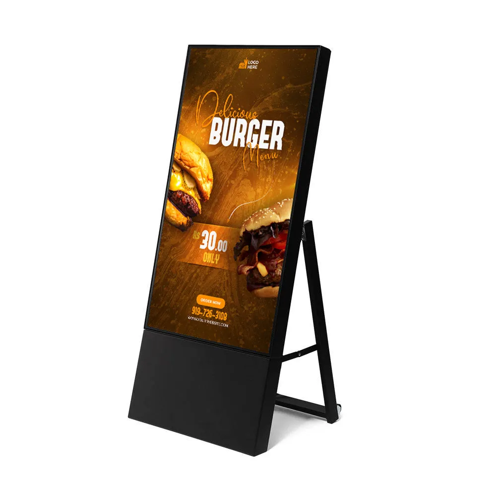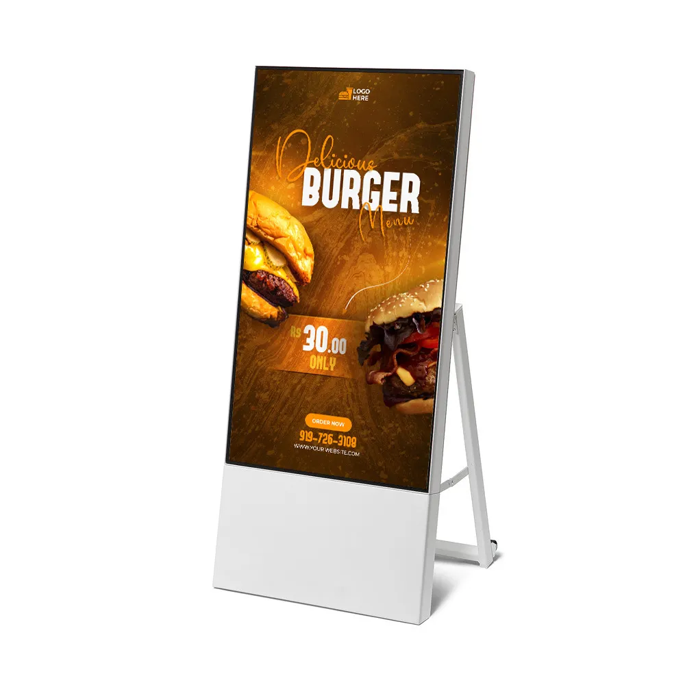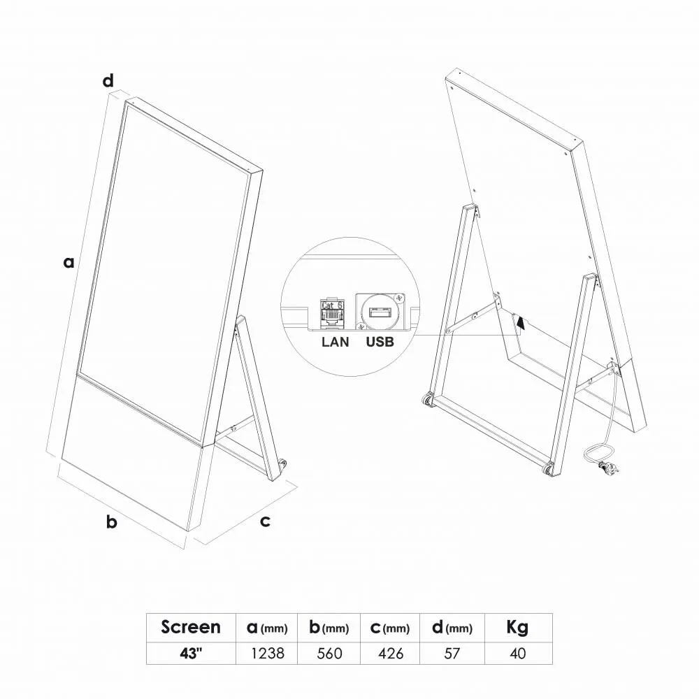 Digitální áčko s obrazovkou 43" v elegantním, štíhlém designu. Skládací kovová konstrukce s kolečky, vysoká viditelnost obsahu a provedení v bílé nebo černé barvě pro interiérové prezentace.