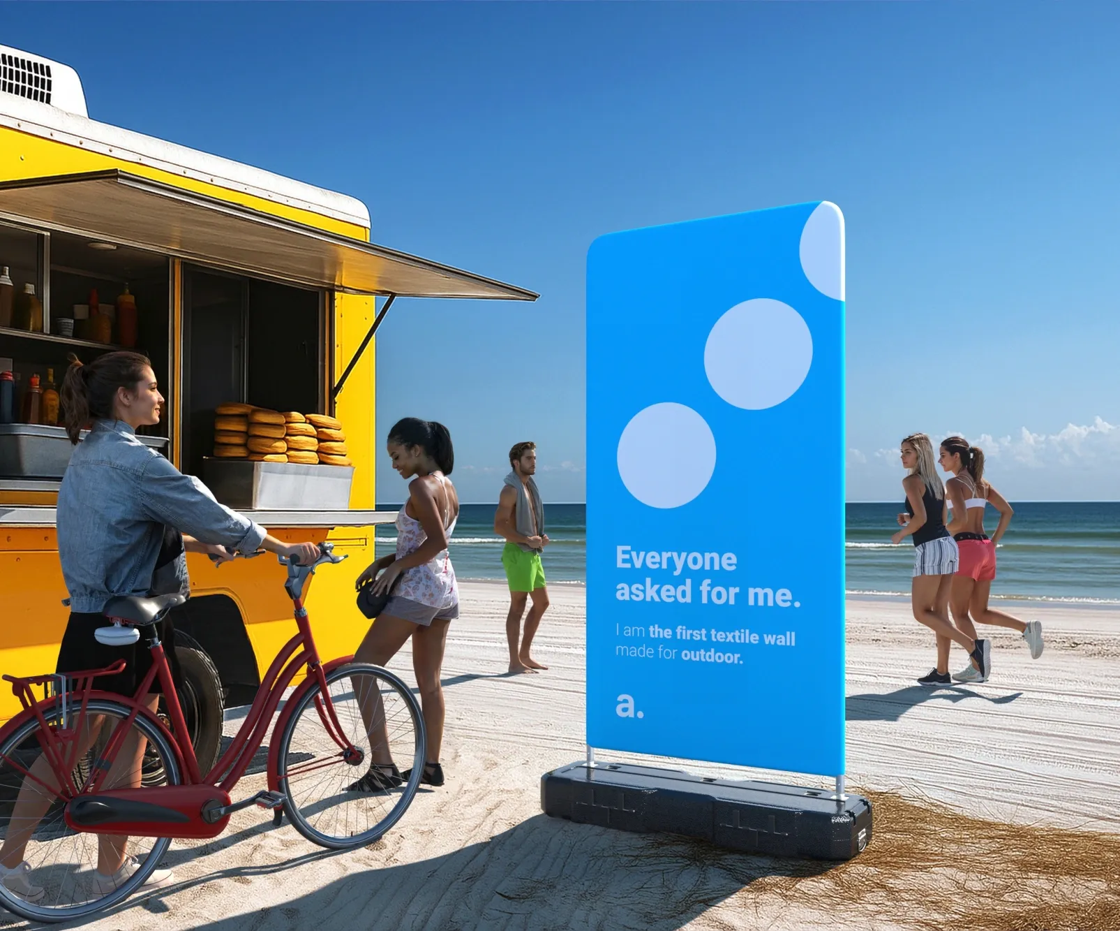 Venkovní reklamní stěna Shape je navržena speciálně pro open-air akce a náročné venkovní podmínky. Stabilní základna umožňuje naplnění vodou, čímž zajišťuje pevný stoj i na nerovném povrchu, například na písku nebo trávě.